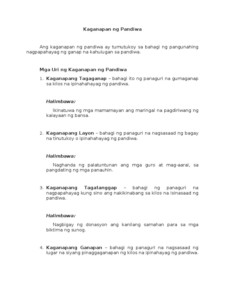 Ilan sa mga halimbawa ng salitang ginagamit bago ang pandiwang ito ay ang bukas sa susunod sa makalawa balang araw pagdating ng panahon at marami pang iba. Katawanin - Uri ng pandiwa na ganap o buo ang diwang ipinahahayag at nakakatayo na itong mag-isa. Mga pang-unahan at panlapi.